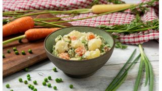 סלט תפוחי אדמה טבעוני עם גזר, אפונה ירוקה ומלפפון חמוץ בתיבול מיונז טבעוני ביתי.