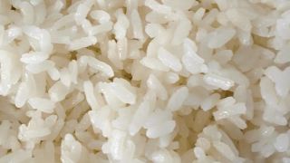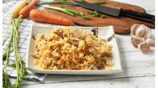 תבשיל אורז עם חומוס, נתחי עוף טבעוני מחלבון סויה, גזר ובצל עם נגיעות שום וכמון