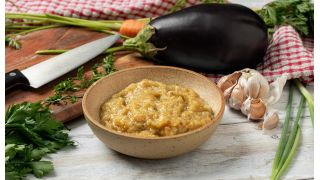 סלט חצילים טבעוני שרופים עם שום כתוש.