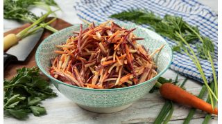 רצועות דקות של גזר, קולורבי וסלק בתיבול רוטב בוטנים טבעוני