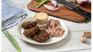 קבב טבעוני מחלבון סויה עם צנוברים קלויים, בצל קצוץ ופטרוזיליה. תובל בסגנון ים תיכוני עם כמון, קינמון, אגוז מוסקט ומלח