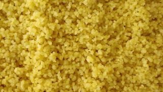 קינואה לבנה עם עגבניה, מלפפון, פטרוזיליה ובצל סגול קצוצים. הסלט טבעוני מגיע מתובל עם לימון ושמן זית