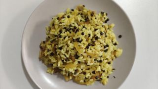 אורז עם עדשים שחורות טבעוני ומלא בצל מטוגן.