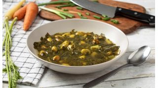 מרק פול טבעוני חריף וריחני עם מנגולד, סלרי, כוסברה, פטרוזיליה, לימון פרסי, שום ופלפל חריף.