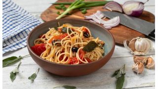 מנת פסטה טבעונית קלילה עם לימון, מרווה, זיתים, עגבניות, שום ושמן זית