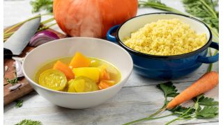 קוסקוס טבעוני עם מרק ירקות עשיר. גזר, דלורית, קישוא, תפוח אדמה, בצל, סלרי, כרוב וגרגירי חומוס. ליטר מרק וליטר קוסקוס