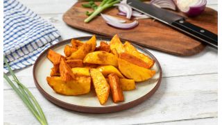 חצאי בטטה אפויים עם שמן זית ומלח בליווי סלסת פלפלים צבעונית ומפתיעה. מומלץ לזלף מעל מעט טחינה גולמית. מוצר טבעוני, ללא רכיבים מהח